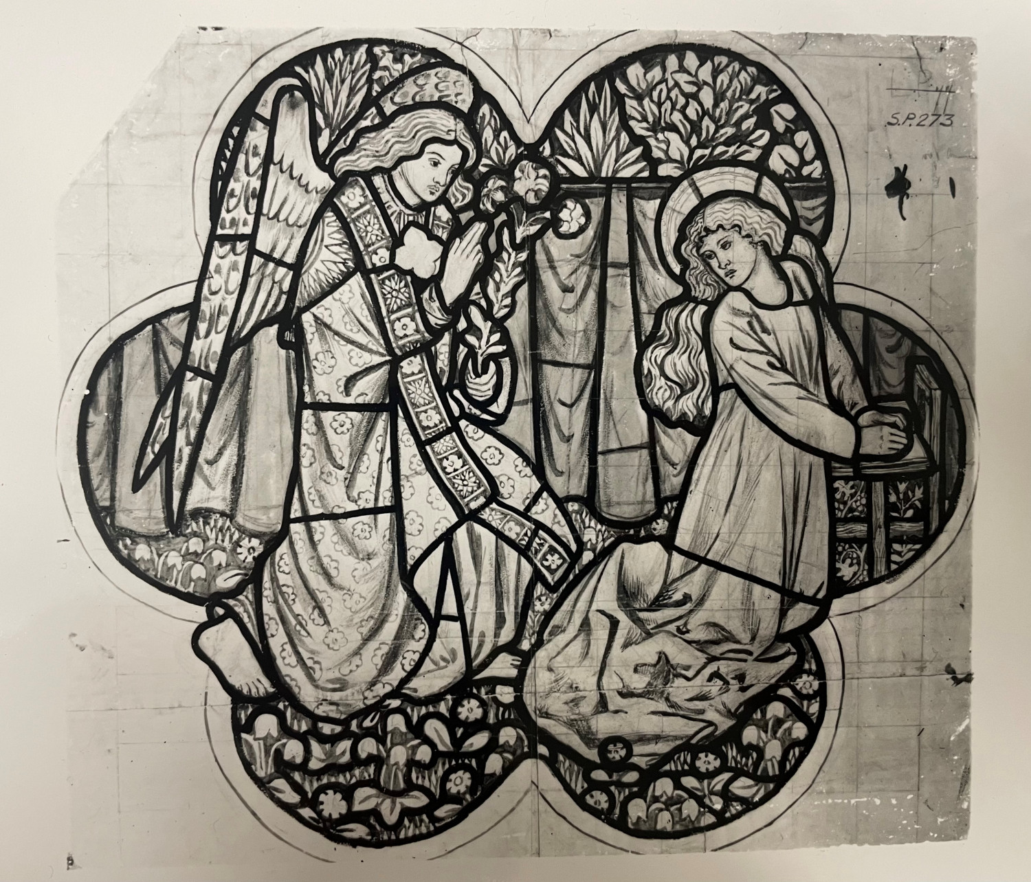 The present cartoon, which was not used again elsewhere, is an adaptation of a similar design by Morris for a 2-light window in the chancel, south, of F F Bodley’s church, All Saints, Selsley, in Gloucestershire. In the 2-light Sesley window (cartoon 1861, window 1862) the figures of Gabriel and the Virgin are contained in panels set into square, patterned quarries, inscriptions running below each panel,with decorative tracery in the head of the window. The cartoons for the Selsley window were only used on one other occasion (St Stephen’s Parish Church near St Peter Port, Guernsey; top of right and left lancets in west window) and are now in the Ashmolean Museum, Oxford, purchased from Morris & Co. 1940.