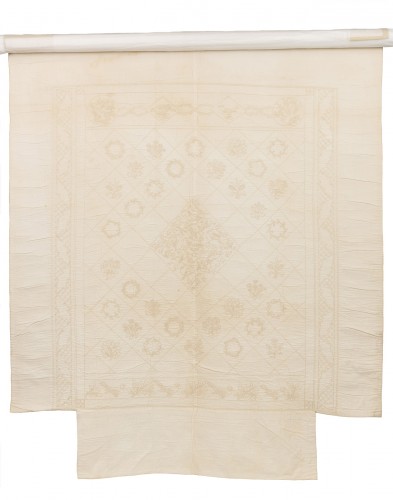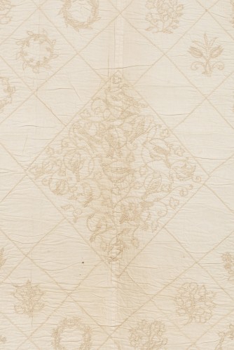 This bedspread was made by May Morris. It is embroidered in ivory silk on a white cotton background. May mainly used her favourite embroidery stitch- chain stitch- to create an overall design of geometric network filled with flowers, wreaths and birds. The bedcover belonged to May’s friend Mary Annie Sloane, who exhibited it under May’s name at the exhibition of Cotswold Craftsmanship in 1951.