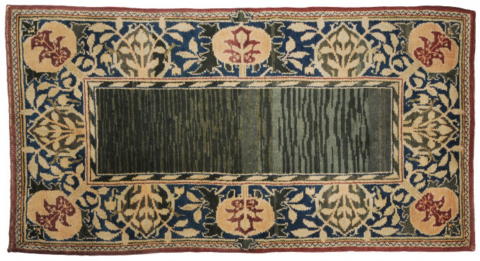 Hand-knotted Hammersmith rug with stylised floral border enclosing a central panel. This rug was given to the Gallery by Martha Wooldridge, (1863-1958) a classical dancer who purchased it around 1898 for her home, the Arts & Crafts House called ‘Wavertree’ in St Margarets, Twickenham, which she shared with the radical preacher Stewart Headlam (Headlam is perhaps most famous for putting up half of Oscar Wilde’s bail when he was tried for ‘gross indecency’ in 1885).