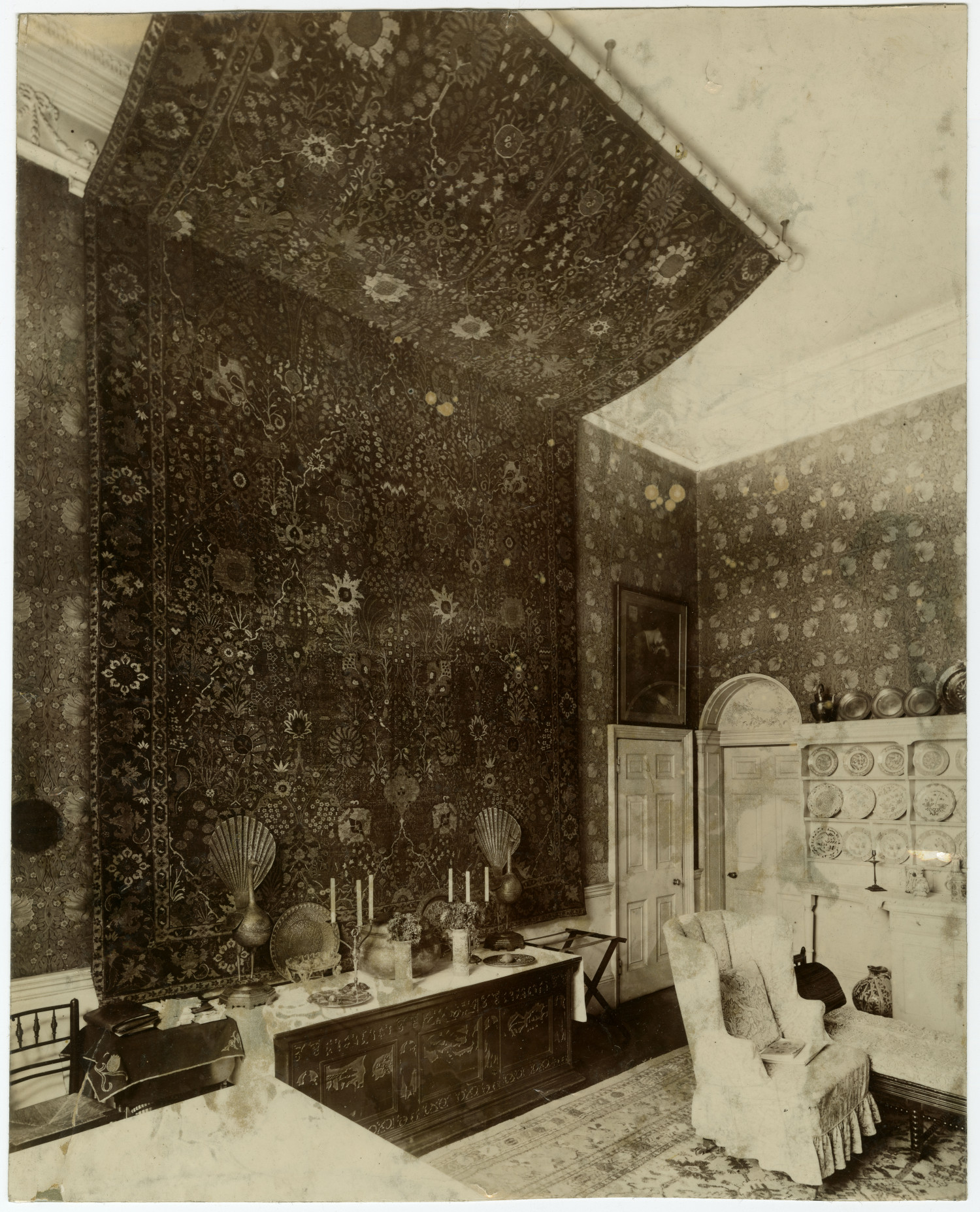This photograph captures the dining room of Kelmscott House in Hammersmith, home of the Morris family. Dominating the space is a magnificent 17th-century Iranian ‘Vase’ carpet, dramatically draped across the wall and ceiling. The carpet was given to the V&A by Jane Morris when she left Kelmscott House in 1897. In front stands a Cypress wood chest displaying examples of Iranian metalwork, including two brass peacocks that are now at Kelmscott Manor. Above the doorway hangs a portrait of Jane Morris by Dante Gabriel Rossetti.