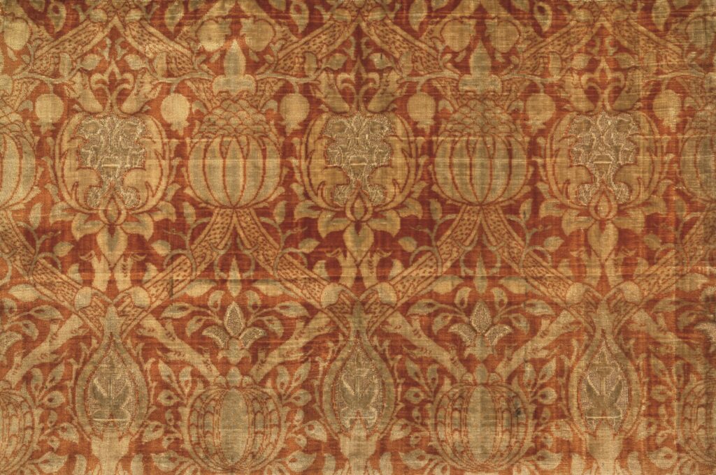 Designed by William Morris 1884, manufactured by Morris & Co. Silk velvet brocade with silk thread