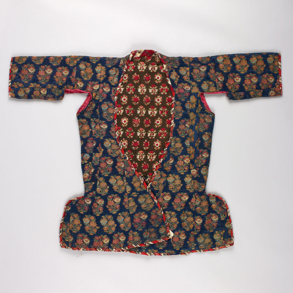 This jacket from the Qajar period (1794–1925) is an incredible example of 18th-century Iranian textile craftsmanship. The garment combines Iranian silk and metal thread, lined with European roller-printed cotton, designed with aesthetic appeal and practical functionality. The jacket was typically worn over a blouse and featured a wide bottom section, allowing for a full skirt to be worn.