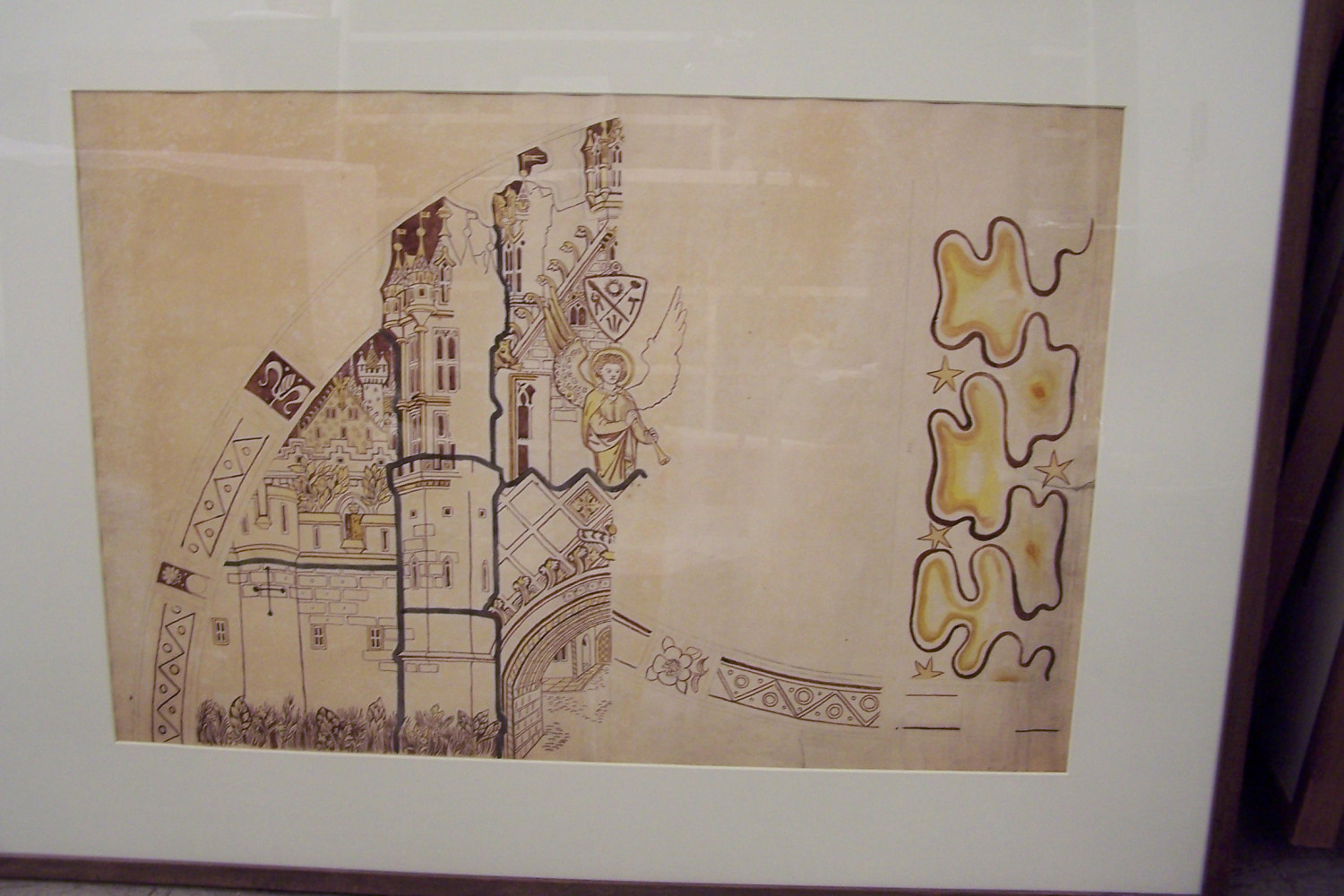 Philip Webb’s design for the canopy of the East window of St John the Apostle, Torquay, Devon. The overall window was designed by Edward Burne-Jones working for Morris, Marshall, Faulkner & Co. in 1865, the overall theme was of the Church Triumphant in the Heavenly Jerusalem. Webb designed the towers and turrets at the top of the five lights, this is for the central light. The church was designed by the architect G.E. Street who both Morris and Webb had worked for as young men. Burne-Jones designed a further West window for the church in 1890.