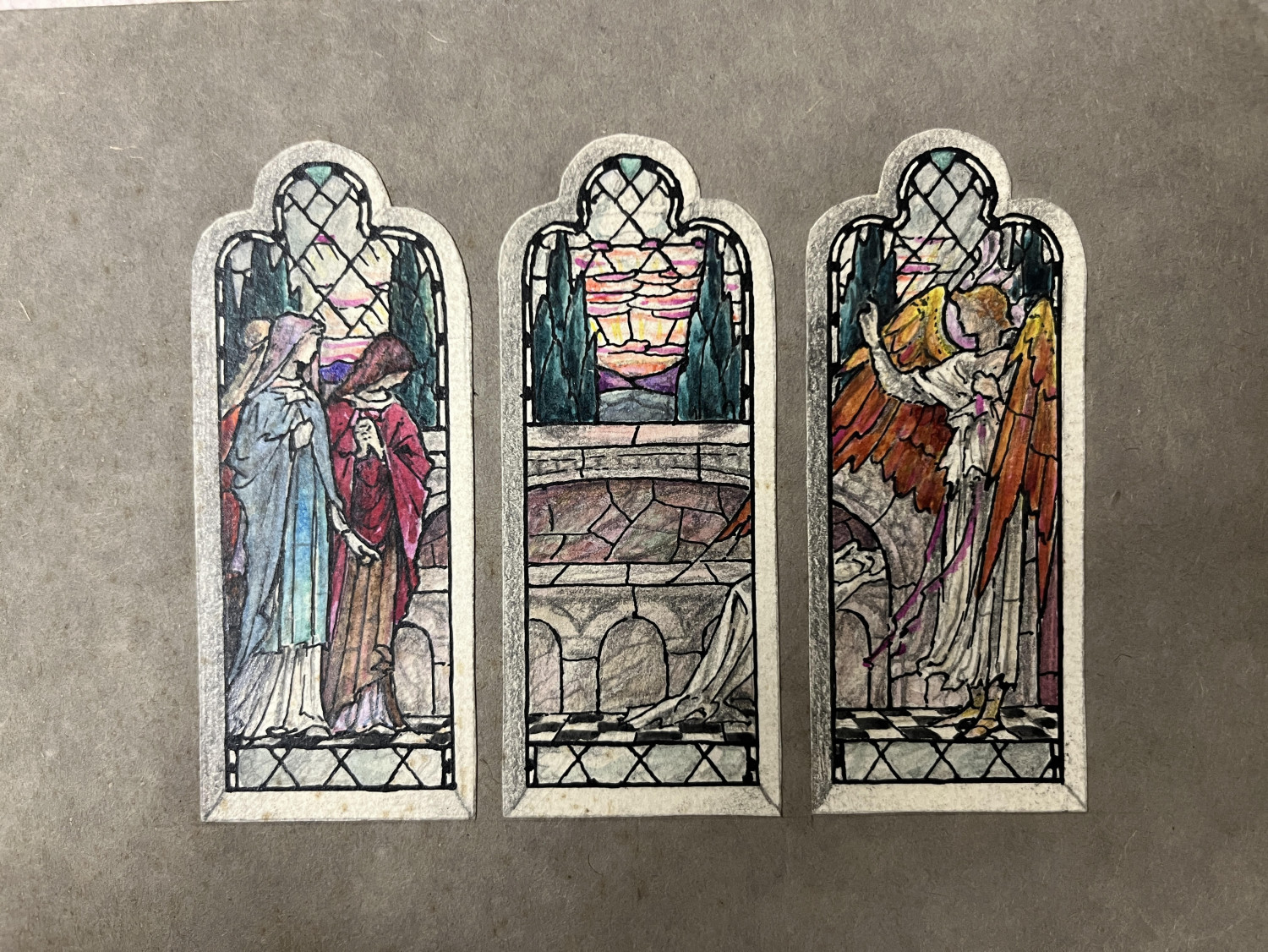 This design for a three light window was designed by Veronica Whall. It depicts The Three Maries a the tomb of the Risen Christ.