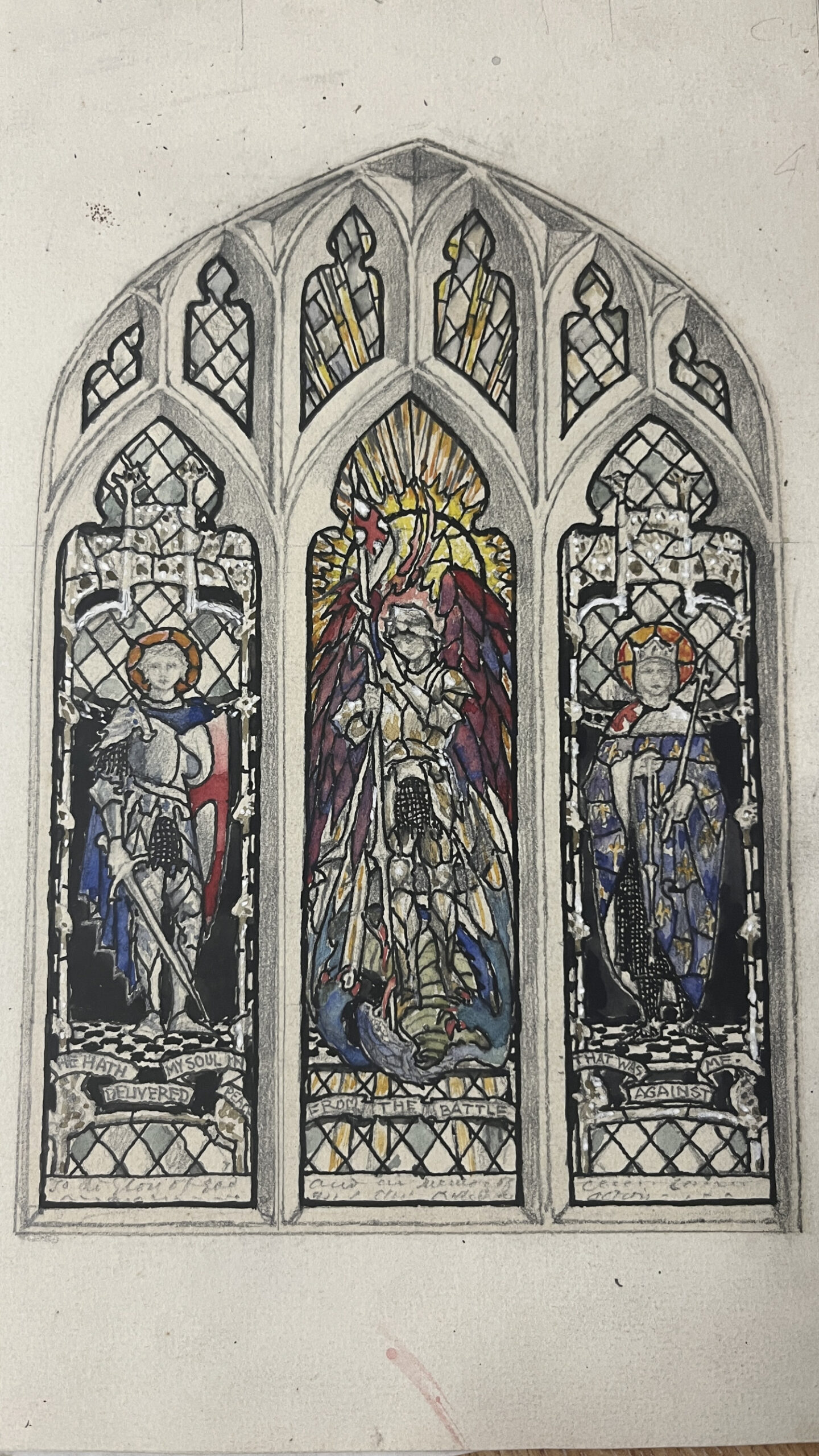This design for a three light window was designed by Christopher Whall in 1920 as a War memorial for St. Matthew Church, Pentrich, Derbyshire. It is in memory of Captain Bernard Ridley Winthrop Smith, 1st Scots Guards, who fell in action at Ypres in November 1914, at the age of 31. St Michael is in the centre, using no weapon but pointing to the banner of the Cross. In the side lights are St George and St Louis, the warrior saints of England and France.