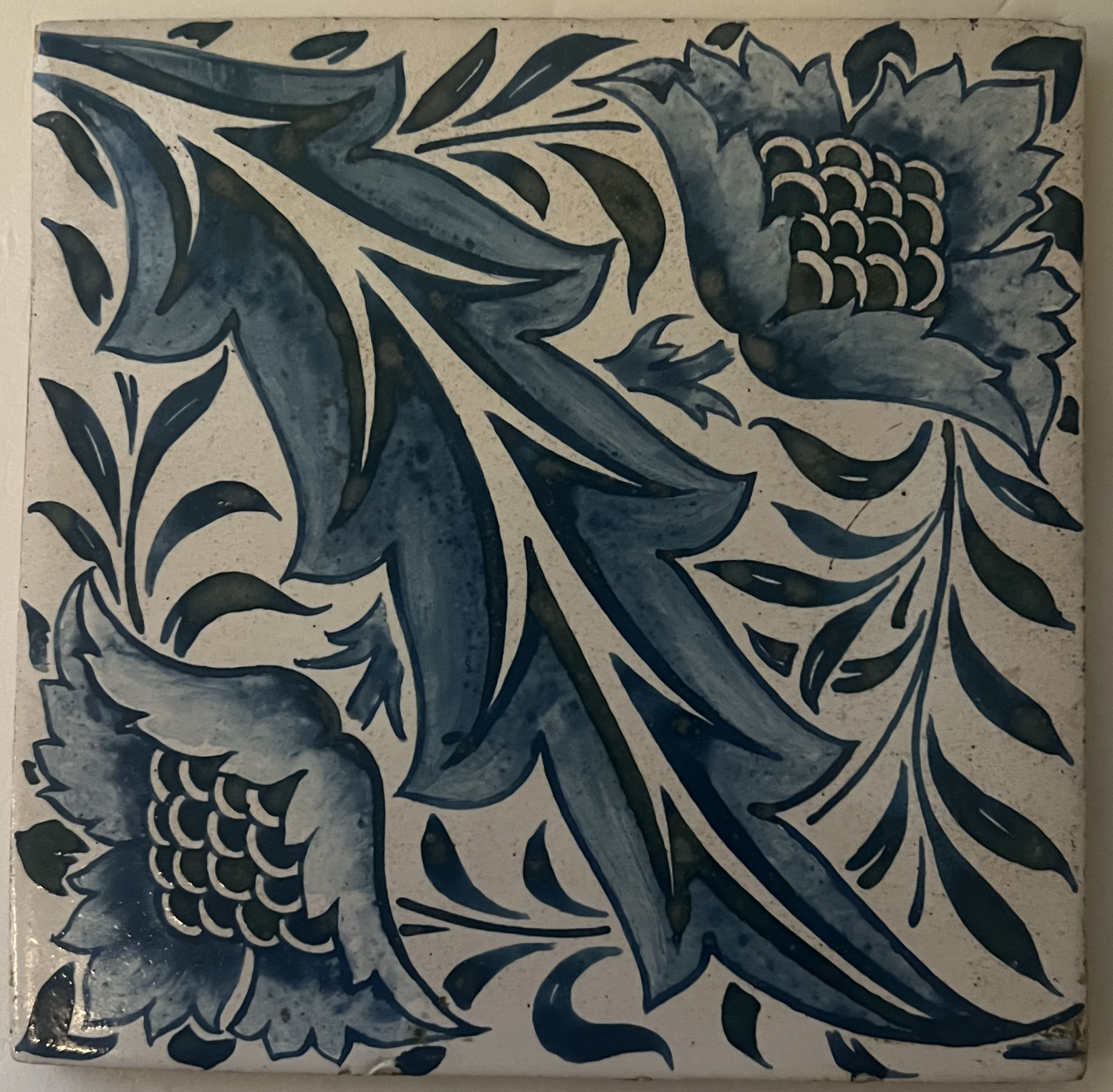 This Diagonal Leaf tile was produced by Morris, Marshall, Faulkner & Co. in the 1870s. The design has been attributed to William Morris or William De Morgan, as it displays stylistic features associated with both designers. It is hand-painted in blue overglaze on a 5-inch tile.