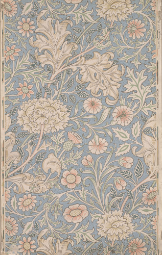 John Henry Dearle first designed this as a pattern for chintz in 1887. It was also available as a printed velveteen and madras muslin, using the name ‘Cherwell’. Morris & Co. started producing it as a wallpaper from 1890 onwards. The pattern combines acanthus leaves and flowers, including pinks, thistles and chrysanthemums on a dotted background.