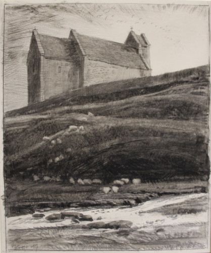 This watercolour is a preliminary study for an etching of the same title. The church is that of St Michael at Duntisbourne Rouse near Cirencester which stands on sloping ground above a valley through which runs Daglingworth Brook, a tributary of the Churn, and was where Ernest Gimson was married. The plate was etched in 1927, with a lower margin containing the title and a dedication: To the Memory of Ernest Gimson, initialled and dated lower left FLG 1927.