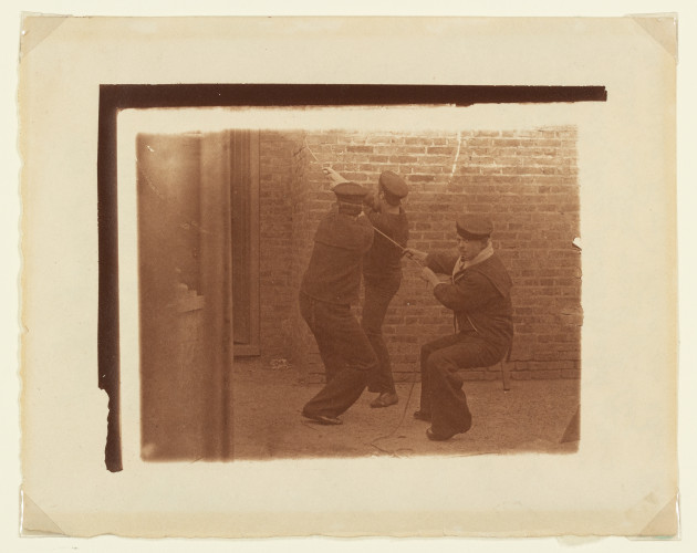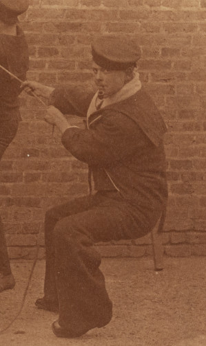 Photograph showing Frank Brangwyn (with pipe to right) in naval uniform with Frank Short and Nelson Dawson. The photograph was used as a study for Frank Short’s articles and drawings on the Naval Volunteers in the Manchester Guardian. The photograph was posed in the yard of the Manresa Road Studios whether the artists were working at the time.