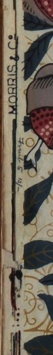 This example is stamped on the right edge ‘Morris & Co’ with their colourway number ‘Fruit 5’ and the price 13 shillings written in pencil on the reverse. It was formerly in the possession of Sir Raymond Unwin (1863-1940), architect, secretary of the Manchester branch of the Socialist League and acquaintance of William Morris.