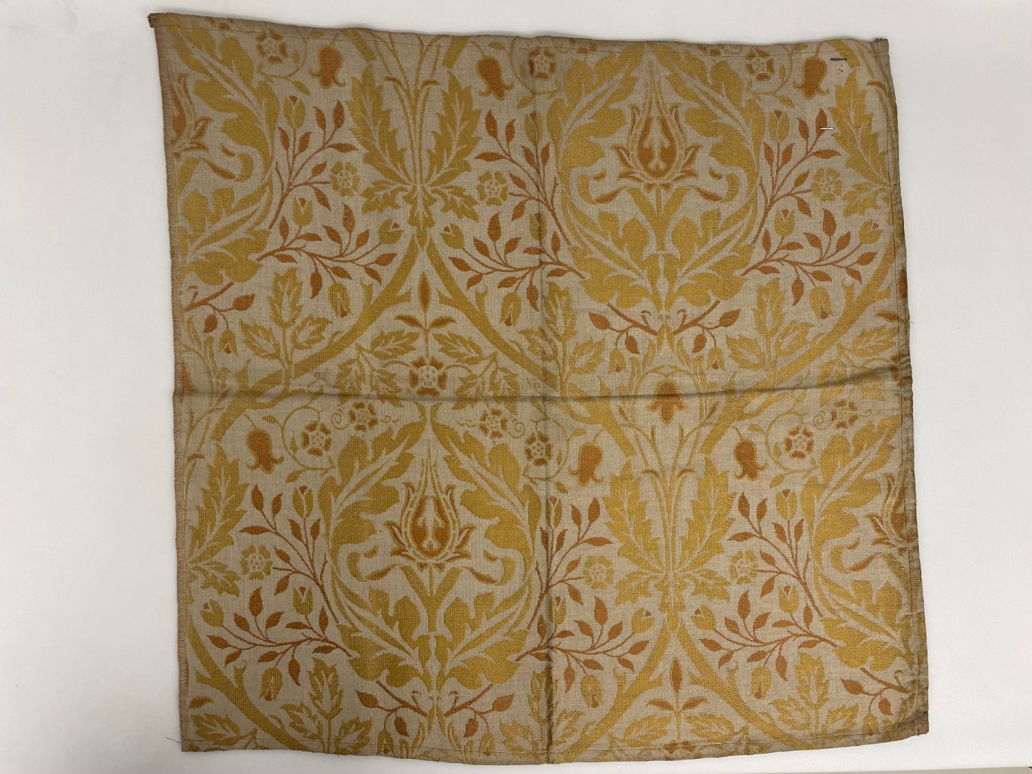 Described by May Morris as ‘fit for a queen’s chamber’, this luxurious fabric is one of the last textile designs attributed to her father. Woven at Merton Abbey on hand-activated Jacquard looms, its shimmering texture is created by the contrast between the linen ground and silk pattern. In addition to its use within wealthy homes, Golden Bough was also popular for church furnishing, a profitable aspect of Morris’s business.