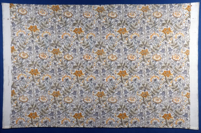 This Morris & Co. printed cotton was designed by Duncan William Dearle. Duncan suceeded his father as chief designer and artistic directior at Morris & Co. when John Henry died in 1932. Duncan provided textile and stained glass designs, as well as running the day to day production in the various workshops. He took his responsibilities seriously but his great love was music: before the First World War he studied music composition in Heidelberg University in Germany (where he also familiarised himself with the art of dyeing), and later got a scholarship to Oxford. He became an accomplished organist and a music composer. According to Edward Pain, an employee of Morris & Co, he was less interested in design than in music, spending his time practising the clarinet. There are only three known designs by Duncan. This is the largest complete example of his design ‘Indian Pink’ which features alternating rows of pinks and bluebells.