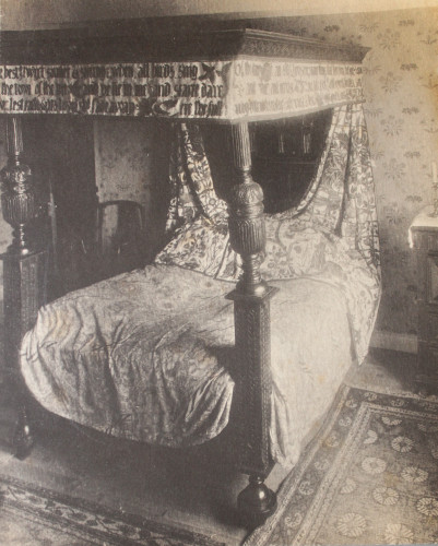 This photograph shows William Morris’s bedroom. The carved four-poster bed is hung with embroidered hangings by William’s daughter, May Morris. The bedroom walls are papered with ‘Lily’ wallpaper, designed by Morris c.1874.