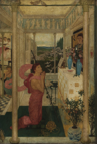 ‘Love’s Altar’ was painted by Walter Crane in 1870. It depicts a young man kneeling before an altar surmounted by a portrait of a young woman. The portrait is of Crane’s fiancée Mary Frances Andrews, whom he later married on 6 September 1871. Crane wrote a sonnet to accompany the work, published in ‘A Book of Verse’, 1891 (see below). It was exhibited at the Old Bond Street Gallery in 1870 described as ‘Love’s Sanctuary’. Whilst on display it attracted adverse criticism, the ‘Art Journal’ describing it an ‘an irreverent parody’ and commenting on ‘the incongruity of medieval treatment coupled with classical costume and accessories’.