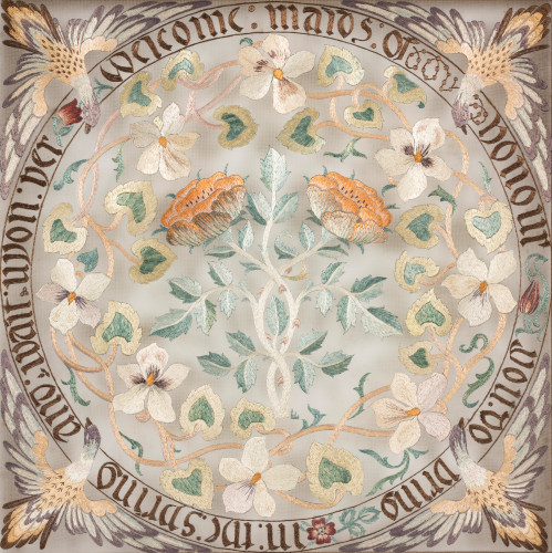 This design was one of May Morris’s most successful embroidery designs. The original design is in the V&A E.956-1954. Examples also exist in the collections of Manchester School of Art, Crabtree Farm and Museum of South Australia. This example is particulaly fine and showcases May Morris’s technical skill, the overall design is worked in split, long, short and satin stich in silks on a gauze background. The outer border of the roundel is inscribed with the opening lines of Robert Herrick’s (1591-1674) poem ‘Welcome, maids of honour, you do bring in the Spring and wait upon her,’ worked in Gothic lettering. Four birds with outstretched wings are placed in the four corners.