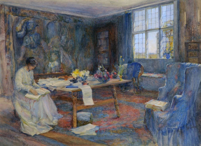 A letter from May Morris to John Quinn (Easter Monday 1912) states ‘I have a guest, who is painting just now, my colleague on the Women’s Guild of Arts. She is doing for me a picture of Father’s bedroom, and another of this room [Tapestry Room] with me half in the picture, at work – her idea – , and if I like them well enough they are going to you. Indeed they were to be done for your birthday, but may not be ready. I wanted to do them myself, dear, but there is no time, and besides mine would have been but clumsy things.’ A second letter to Quinn (25 April 1912) adds ‘I am sorry Miss Sloane’s Kelmscott drawings were not finished in time to send. I hope you’ll like them when they come. They are really rather charming. She is distinguished artist in her line, and a pleasant-house-mate, quiet and serene and contained.’