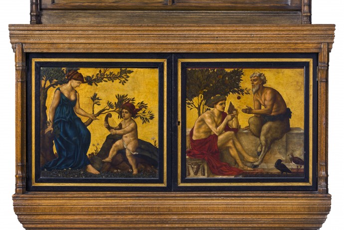 This cabinet was designed by Philip Webb and decorated by William de Morgan for Morris, Marshall, Faulkner and Co. It was originally one of a pair (the other with panels showing St George & the Dragon also by William De Morgan) made for Isabel Olga Lucas, née D’avigdor (1843-1926) widow of the artist Horatio Joseph Lucas. The painted panel on the left has a scene of two figures variously described as (female on the left) Hera/Juno or Muse Erato or Maia with (male boy on right) the young Hermes/Mercury with the first lyre; the painted panel on the right with a scene of two male figures variously described as (on right ) Pan or Silenus instructing Dionysus/Bacchus (on left) to play pipes.