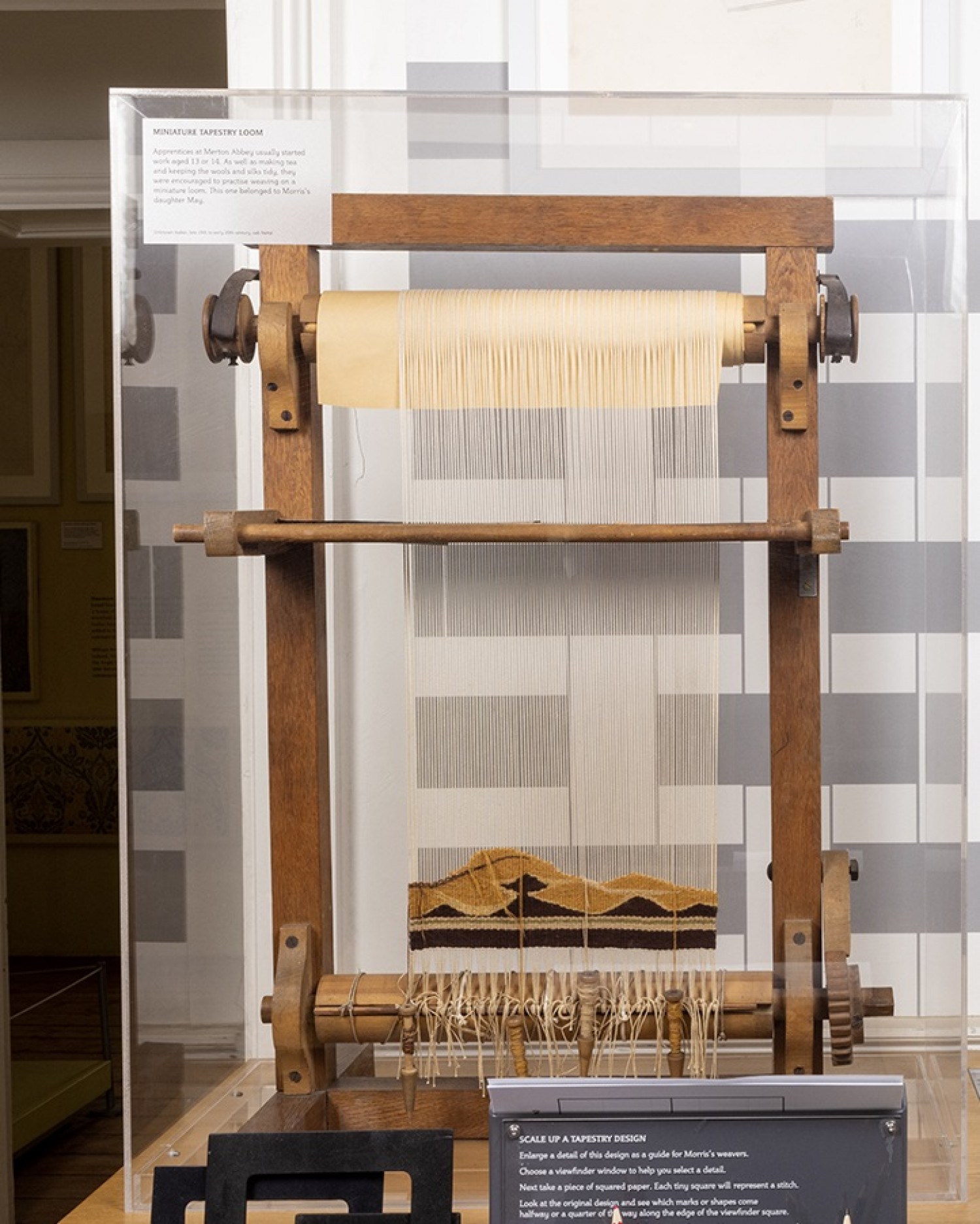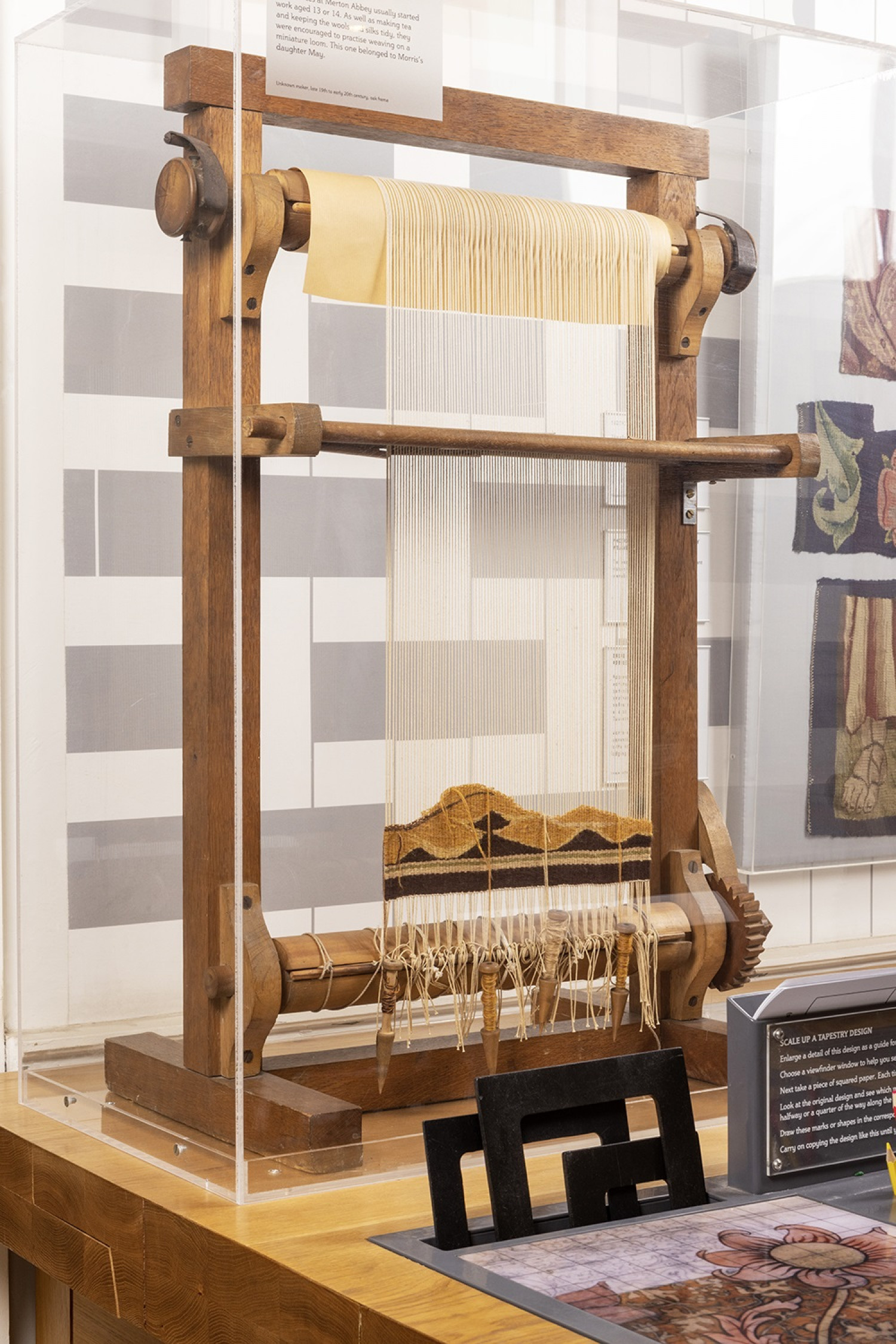The loom is a high-warp tapestry loom, the frame in oak with metalwork fitments, threaded with a cotton warp and partially completed tapestry based on a Morris-inspired border pattern. The loom is probably identical with the loom referred to in the 1939 Kelmscott Manor sale catalogue as ‘oak weaving loom with unfinished tapestry of ‘The River Thames’ worked by Miss Morris and a box of various wools etc’. The bobbins threaded with coloured wools, samples of various coloured wools wound round old envelopes addressed to May Morris, and two warp combs were also purchased with the loom and are in the Gallery’s collection.