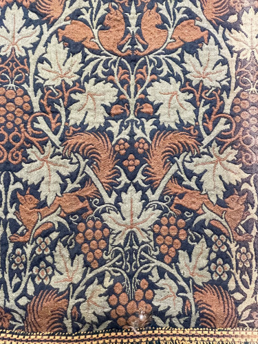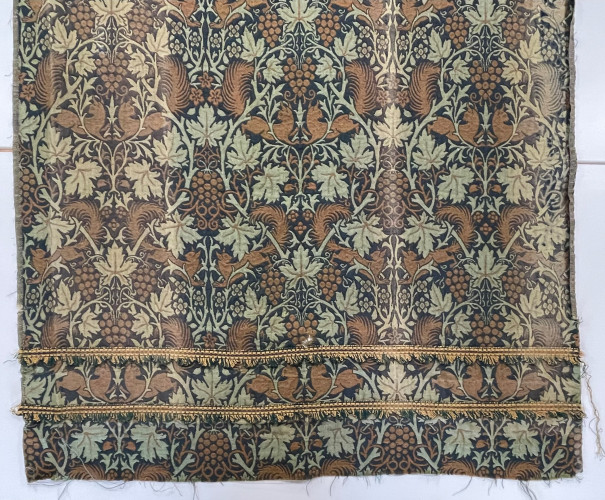 This woven wool was designed by John Henry Dearle for Morris & Co. around 1898. The repeating pattern is formed of orange coloured squirrels amongst a grape vine heavy with fruit. Originally entitled Fox and Grape after the Aesop fable, it was later changed to Squirrel, presumably because the animals more closely resembled the form of a red squirrel. Although many of Morris & Co’s patterns feature birds, beside the rabbits in the popular ‘Brother Rabbit’ pattern and these squirrels, there are no other examples of animals in the Firm’s repeating textile patterns. This example was once one of a pair of curtains and features two widths of decorative fringing at the bottom. The wool was produced on a jaquard hand-loom at Morris & Co’s factory Merton Abbey and came in three colourways. Dearle’s original design drawing is in the Huntington Art Collection, USA.