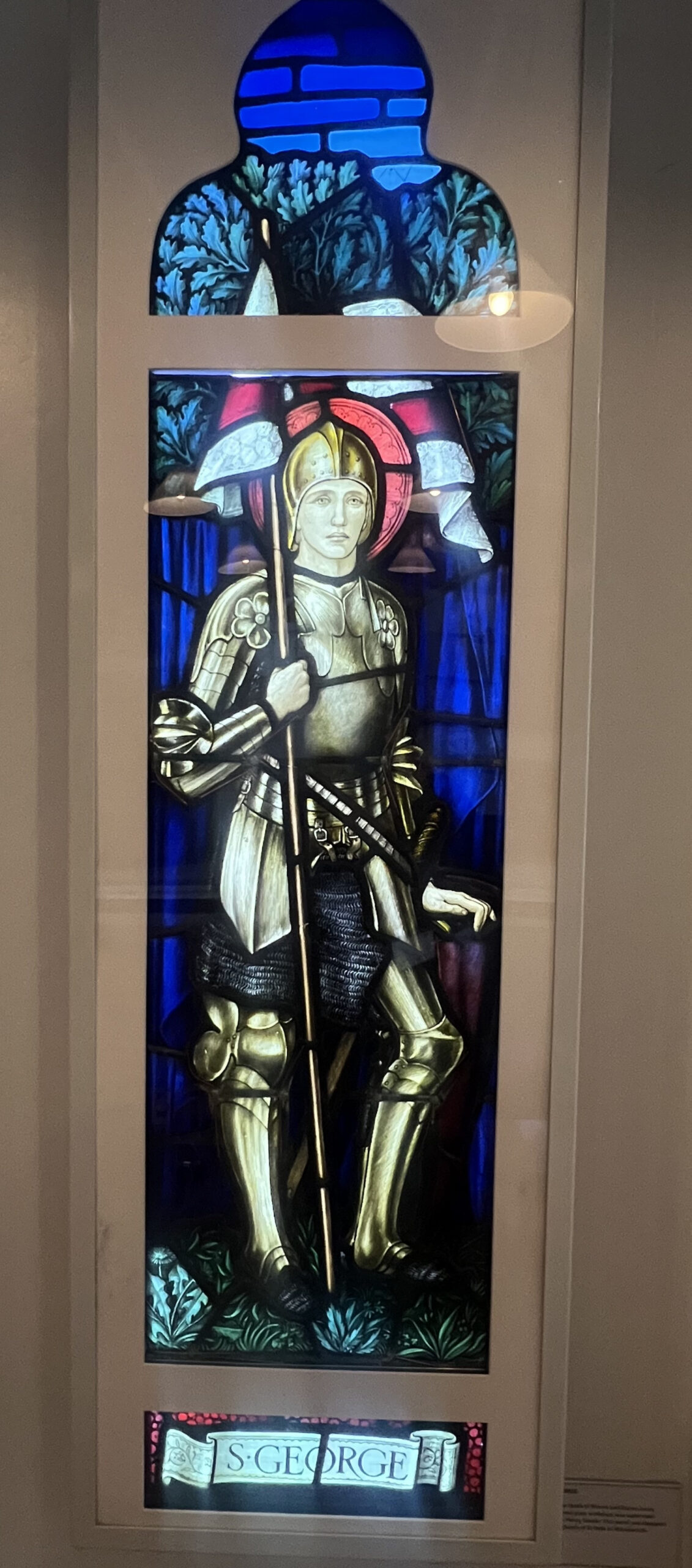 Commissioned for St Faith’s Church, Wandsworth, installed c.1921; removed during demolition (1980s). Inspected by Michael Coles (NDD ARCA). Originally paired with a companion St Michael panel (see C286). Design attributed to Henry Dearle, produced by Morris & Co. The panel was removed when the church was decommissioned (1980s). Documented by Parish Council of St Anne w. St Faith in correspondence c. 2010.