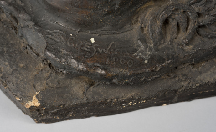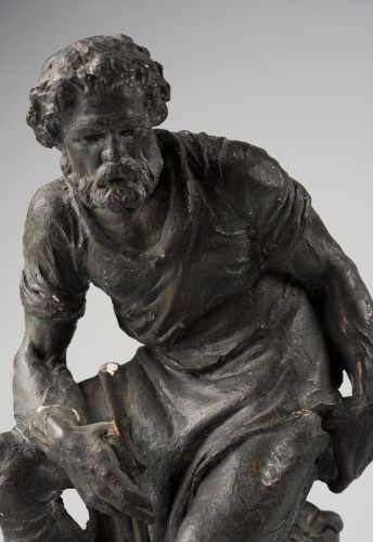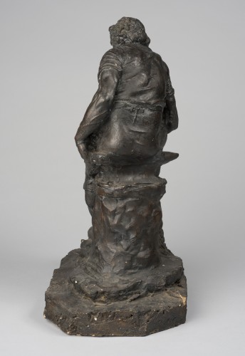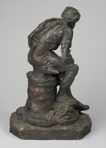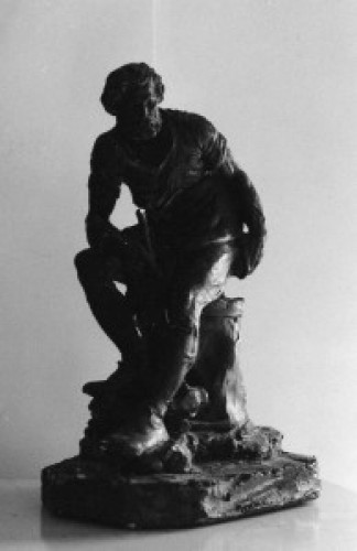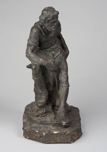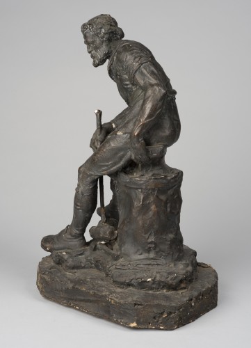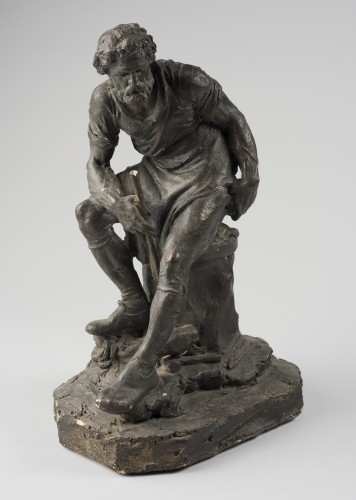 Man in shirt, trousers and apron seated on an anvil looking slightly downwards and leaning forwards to rest his arm on one knee, his foot resting on a pile of horse-shoes below and hammer and pincers, holding a long-handled mallet in one hand, the other resting on the edge of the anvil.