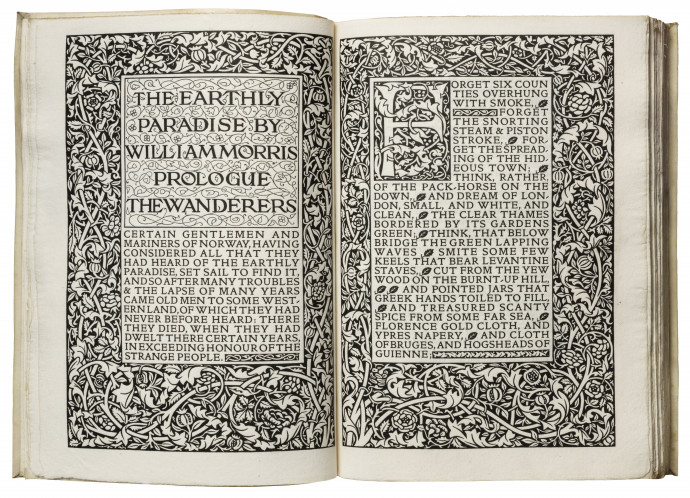 Eight volumes of William Morris’s The Earthly Paradise, printed by The Kelmscott Press and bound in white vellum. Taking the form of a compendium of different narratives, The Earthly Paradise is an epic poem structured as a frame story, similar to Geoffrey Chaucer’s Canterbury Tales. It tells the story of a group of Norsemen who have fled a plague in Europe in search of the mythical earthly paradise. Eventually they come to a land where the inhabitants still worship the ancient Greek gods. They decide to stay here and each month the wanderers and the city elders exchange tales. ‘The Earthly Paradise’ contains the tales from a whole year, comprising twenty-four stories. Through this narrative Morris draws both upon Greek myths and Medieval Romance tales, including Icelandic Eddas and Saga.