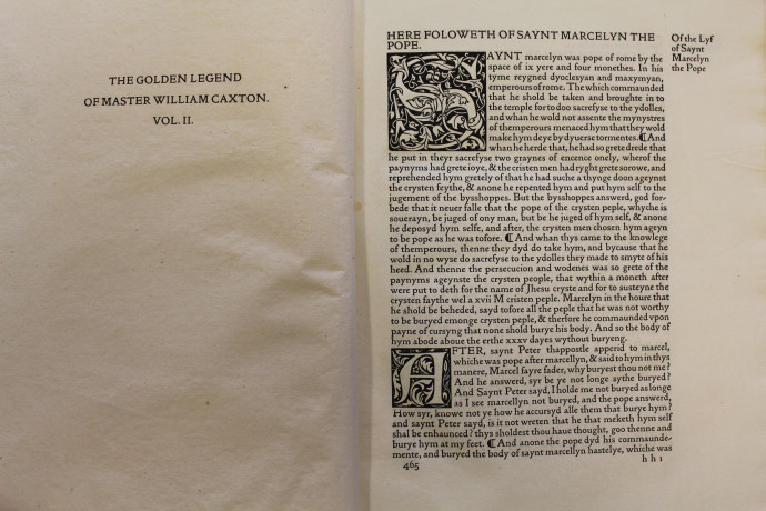 ‘The Golden Legend’ was intended to be the first title issued by the Kelmscott Press, but was delayed because of its length (some 1,300 folio pages) and the fact that the original paper delivery was not sized correctly. The text is by Jacobus de Voragine and is a thirteenth century collection of saints lives, it was one of the first books printed in English by William Caxton who also translated it from Latin. Kelmscott Press editor, FS Ellis’s daughter Phyllis transcribed Caxton’s first edition from Cambridge University Library. The illustrations are Edward Burne-Jones and it is one of three volumes (see also K17a and K17c). 500 copies on paper were printed, none on vellum.