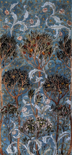 This drawing is a preliminary small-scale finished drawing for an embroidered panel ‘The Orchard’. An article in the Century Guild’s publication ‘Hobby Horse’ Vol. 3 1888 refers to May Morris having just completed the finished embroidery as a pair of curtains. ‘The Orchard’ became one of May Morris’s most popular designs. The Day book of the embroidery section of Morris & Co. which runs from 1892 – 96 (now in the V&A Museum) lists five versions made in 1893 alone. The panels were made as portieres each taking about fourteen and a half weeks work and cost £48 when sold fully completed.