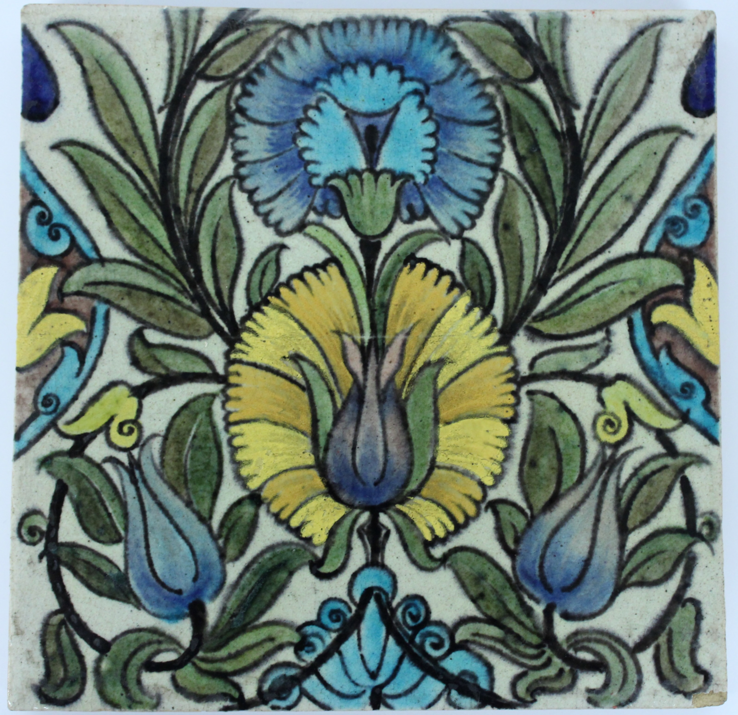 This tile by William de Morgan is painted in yellow, blues and greens with a net pattern including carnation type flowers and leaves. The reverse of the tile is impressed with a Tudor rose and “Wm. De Morgan & Co. Sands End Pottery Fulham”. The tile was designed to form a larger tile panel, a five tile version of which is in the De Morgan Foundation collection (C_WDM_0223).