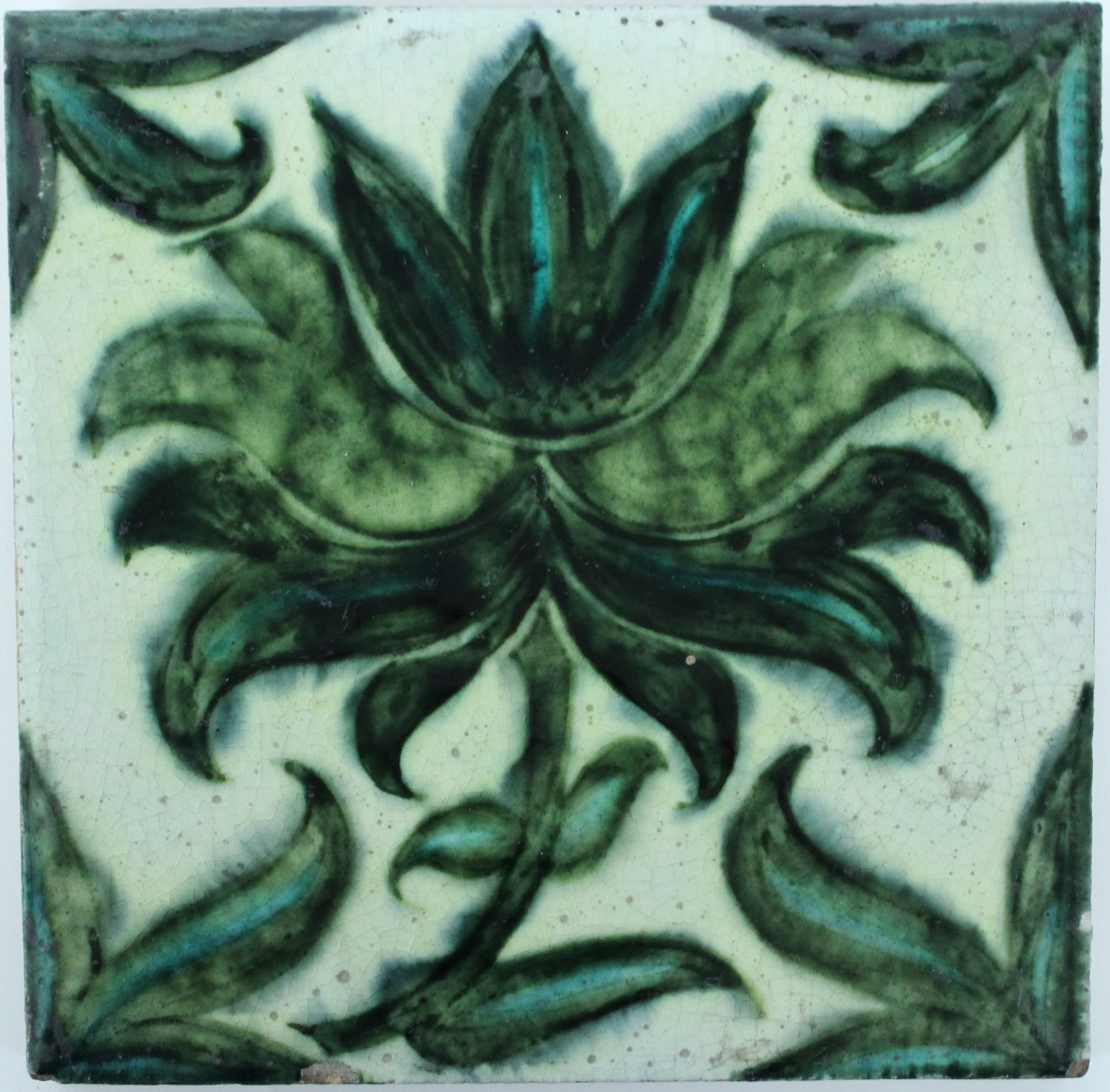 Tile painted in enamel colours with design of a single flower head and stem as central motif, and three leaves in each corner, all painted in three shades of green. Impressed with a Tudor rose and “Wm. De Morgan & Co. Sands Ends Pottery Fulham” which is blurred.