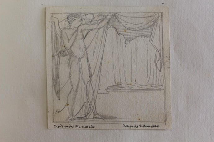 Drawings related to the Cupid and Psyche illustrations and other tales from ‘The Earthly Paradise’ are in the following collections: A volume of 86 preliminary drawings of various sizes executed in pencil, pen and ink or chalk, is now in Birmingham Museum and Art Gallery (648’27). A series of 47 finished designs in pencil on tracing paper was given by Burne-Jones to Ruskin, who presented them to Oxford University in 1875 (now in the Ashmolean). Another volume of 39 drawings formerly in the collection of F.S. Ellis is in the Pierpont Morgan Library, New York; 36 of these are on tracing paper, the remaining 3 on drawing paper; 21 relate to the Cupid and Psyche story though some are variants of scenes which were never engraved on wood; others are for the Story of Pygmalion and The Hill of Venus.