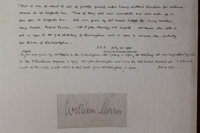 In 1881, a few copies of these sets of illustrations were made, apparently by Morris himself, by friction printing. A second series (numbering about 8 sets according to Sydney Cockerell) was pulled for Morris by Emery Walker at his premises at 16 Cliffords Inn during the Kelmscott Press years; all these were on Kelmscott Press paper. This volume (one of the 8 sets) was given to Sydney Cockerell by Jane Morris c.1898. Other sets are in the Pierpont Morgan Library (Gift of John M. Crawford) and the Fitzwilliam Museum (J.R. Holliday Bequest 1927).